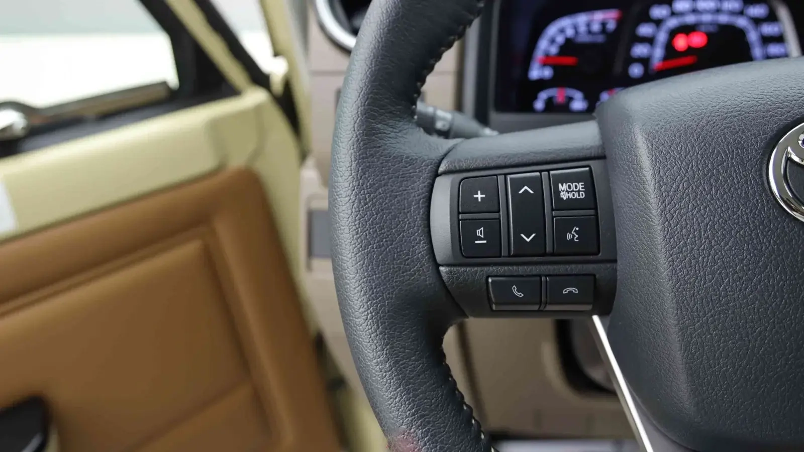 Leather-wrapped steering wheel with wood trim and multi-function buttons